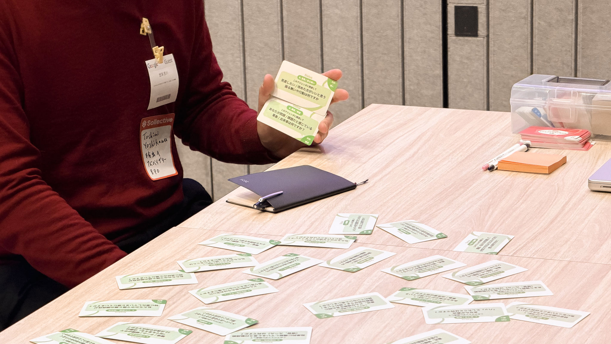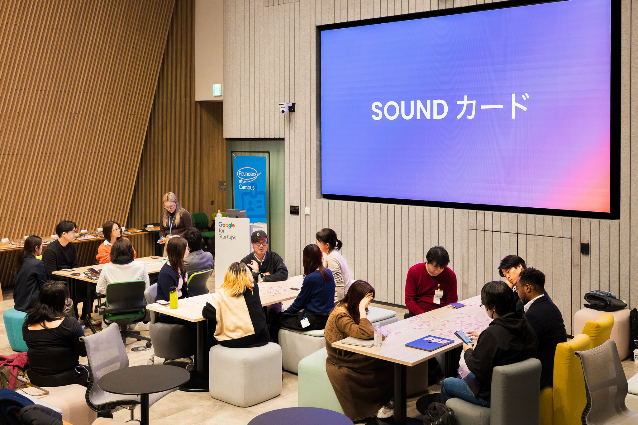 今回、会場となった Google for Startups Campus Tokyo(渋谷)に集まったのは16人のフリーランスです。SOUND コーチの北川真央による進行のもと、グラフィックデザイナー、映像ディレクター、PR など、職種も年齢もばらばらの参加者が3つのテーブルに分かれ、SOUNDカード™ をランダムに広げるところからスタートしました。